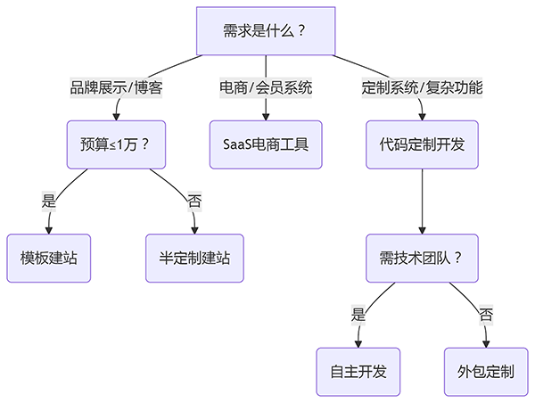 - 預算<1萬元/年且無技術團隊 → 模板建站(年費含服務器/域名)。