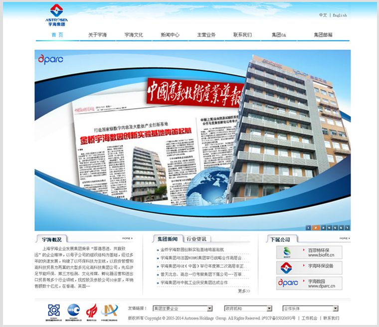 上海宇海企業(yè)發(fā)展集團秉承“厚德思進、共贏致遠”的企業(yè)精神,以母子公司的組織結(jié)構(gòu)為基礎(chǔ),經(jīng)過多年的快速發(fā)展,構(gòu)建了以環(huán)?萍紴橹骶,以投資管理和高科技貿(mào)易為兩翼的大型多元化高科技集團公司,先后涉足節(jié)能環(huán)保、第三方檢測、文化傳媒、孵化器運營和進出口貿(mào)易等多個行業(yè)領(lǐng)域,現(xiàn)控股及參股公司10余家,年銷售額數(shù)十億元。